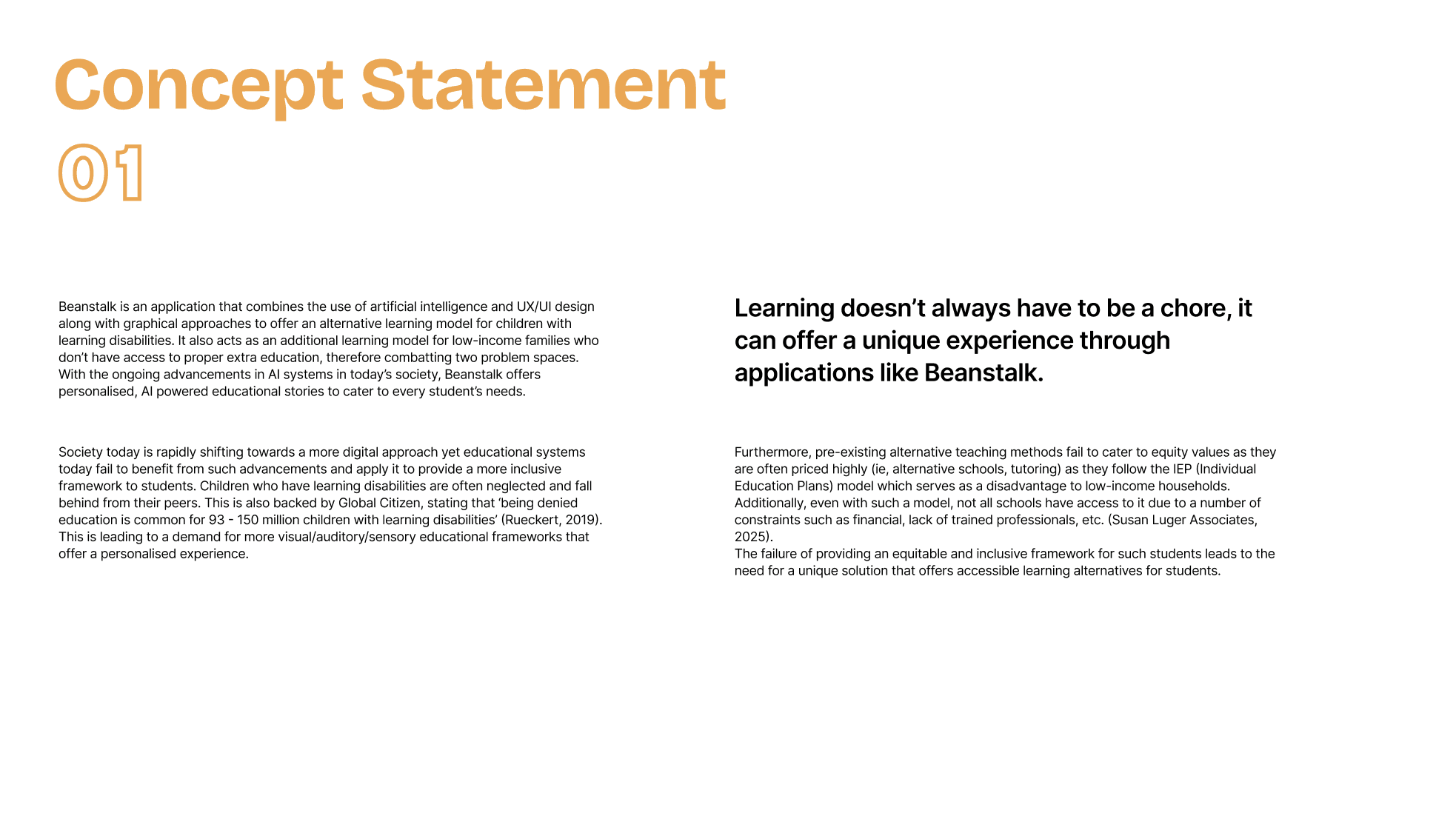 Beanstalk is an AI-powered learning app that transforms education into an engaging, personalised storytelling experience. Designed with accessibility and intuitive UX in mind, it adapts to different learning styles while providing a playful, inclusive environment for both students and parents.